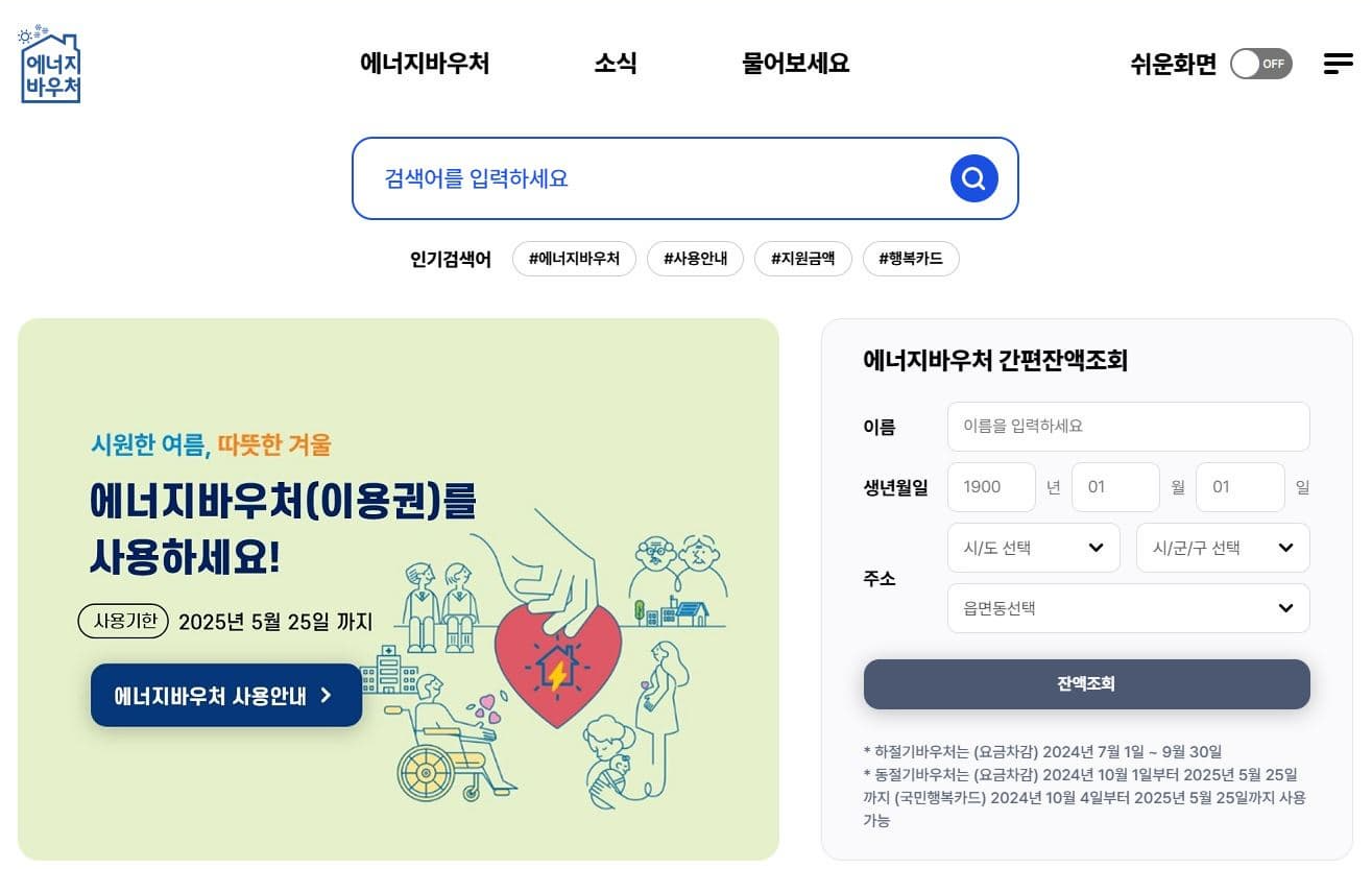 에너지바우처 공식 홈페이지에서 이름, 생년월일, 주소 입력만으로 즉시 잔액 확인이 가능합니다.