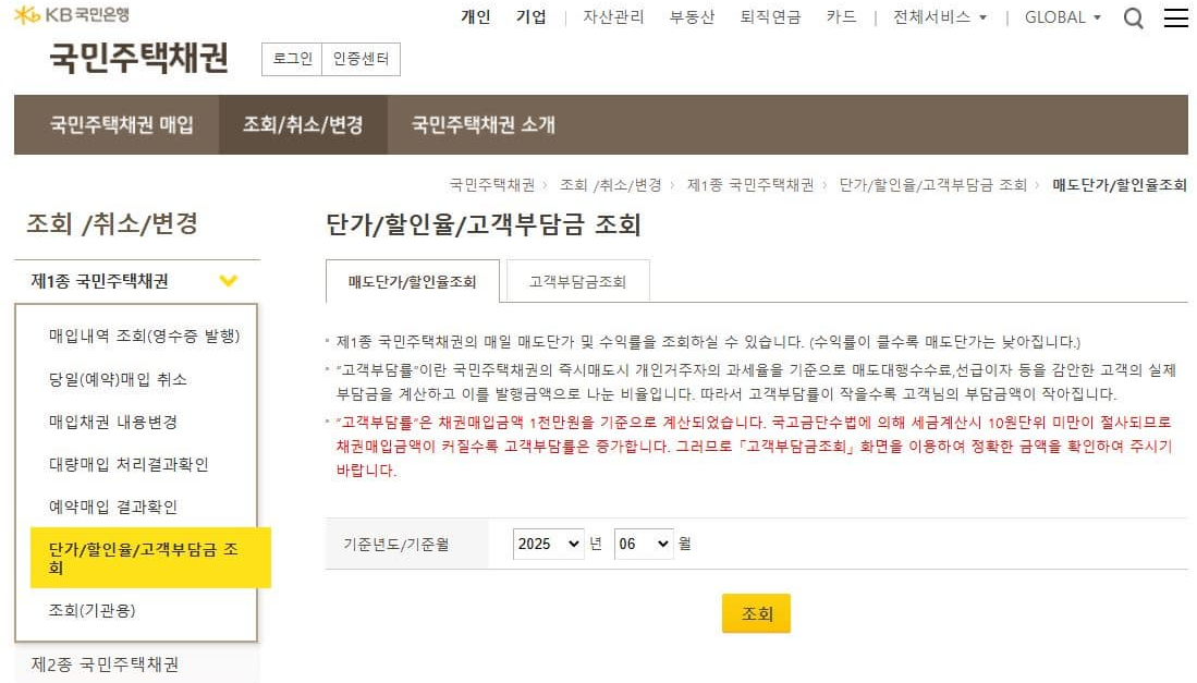 매도단가/할인율조회 ( 국민주택채권 | 조회 /취소/변경 | 제1종 국민주택채권 | 단가/할인율/고객