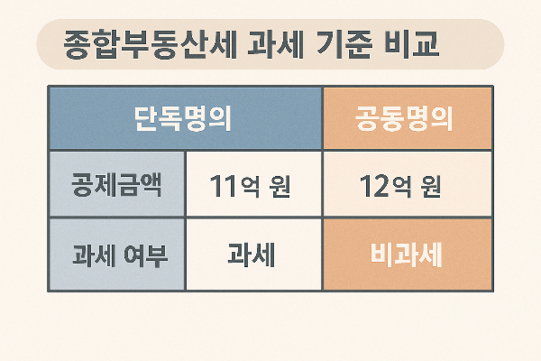 | 종합부동산세 | 공동명의로 공제 기준 이하 분산 | 1주택자 여부 확인 필요 |