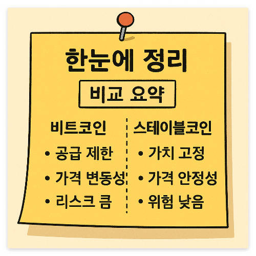 스테이블코인과 비트코인, 둘 다 디지털 자산이지만 방향성과 목적이 전혀 다릅니다.