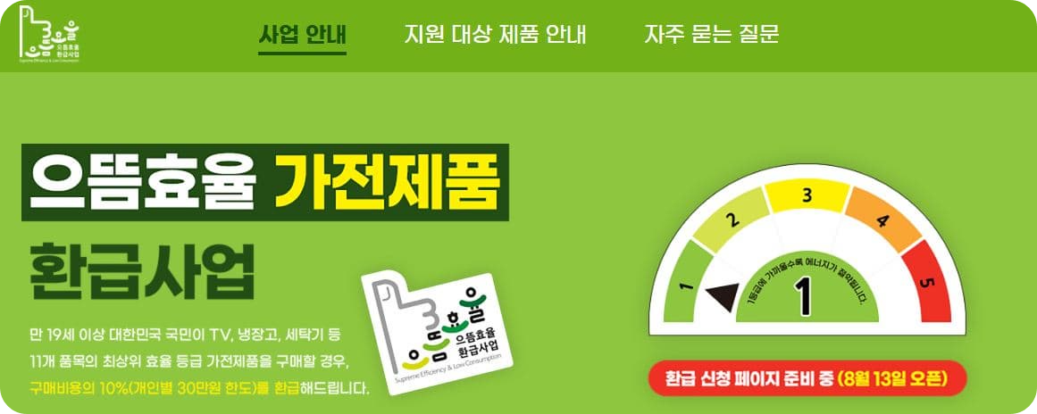 만 19세 이상 대한민국 국민이 TV, 냉장고, 세탁기 등 11개 품목의 최상위 효율 등급 가전제품을 구매할 경우, 구매비용의 10%(개인별 30만원 한도)를 환급해드립니다.
