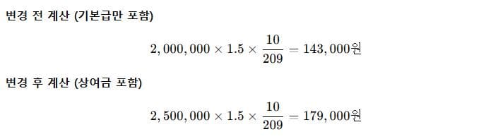 - 변경 후 통상임금: 기본급 200만 원 + 정기 상여금(50만 원) 포함